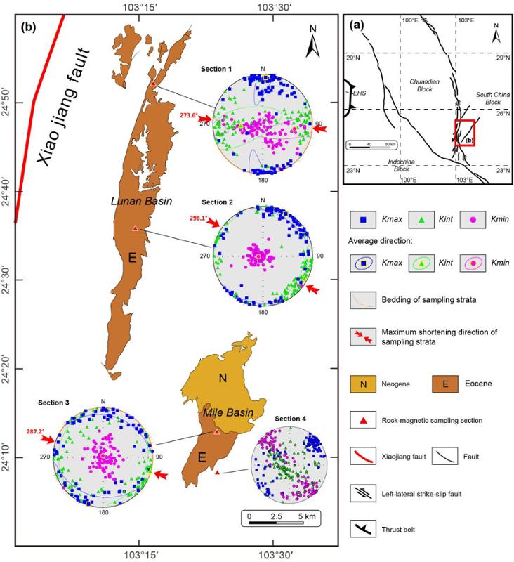 磁组构分析结果揭示,早始新世(约 53–47 Ma)研究区处于 NWW-SEE 向挤压应力场中,表明该时期的小江断裂并非传统认知中以走滑活动为主,而主要表现为逆冲断层性质。盆地底部广泛发育的砾岩与区域不整合面,共同记录了此次构造事件,证实小江断裂的早新生代逆冲活动是青藏高原东南缘构造变形的直接响应(图3)。