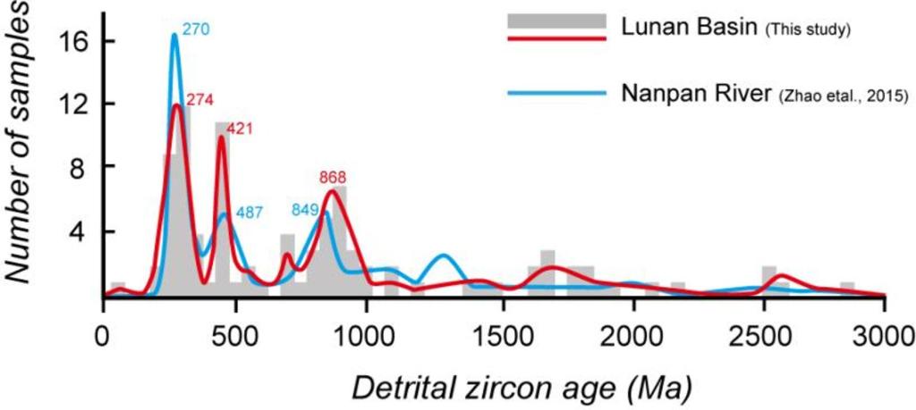 陆南与弥勒盆地的初始沉积年龄被精准限定为 50–47 Ma(始新世早期),与印度–亚洲碰撞的初始阶段(65–49 Ma)在时间上高度吻合。盆地底部路美邑组砾岩以石灰岩和砂岩为主,其成分与盆地西侧的中生代—古生代地层高度吻合;加之古水流方向数据(陆南盆地 SW→NE、弥勒盆地 NW→SE)的支持,共同明确指示沉积物源自小江断裂以西区域。碎屑锆石 U-Pb 年龄谱呈现出 50 Ma、274 Ma、421 Ma 与 868 Ma 四个主峰值,且锆石普遍具有低圆度、高自形性的特征,进一步佐证了物源区距离近、搬运过程短的特点(图2)。