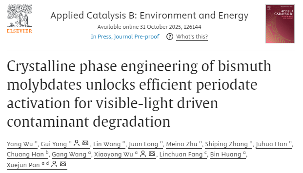 近日,华体会平台环境科学与工程学院潘学军教授团队在新污染物降解去除领域取得重要研究进展,相关成果以“Crystalline phase engineering of bismuth molybdates unlocks efficient periodate activation for visible-light driven contaminant degradation”为题,发表在环境与能源催化领域国际权威期刊《Applied Catalysis B: Environment and Energy》上。